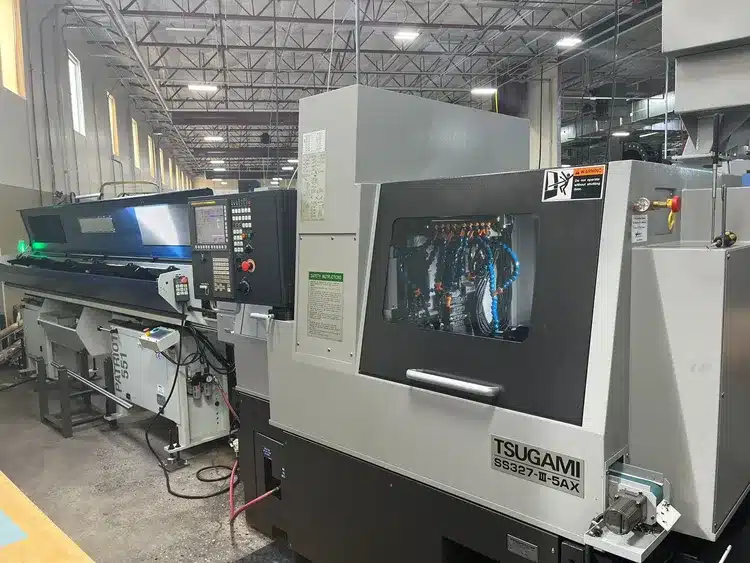 The Tsugami SS327-III-5AX Swiss Type Lathe is an enhanced, high performance automatic lathe. This machine’s servo-driven, modular B-axis allows for the cutting of complex parts, complete in a single setup, while applying the capability for through hole thread whirling or high speed spindles for small surfacing end mills. The B-axis contains live tools (four front, two rear) which can machine in coordination with the C-axis, delivering the ability to cut precise angles and sculpted contours. The B-axis functionality transforms this Swiss type lathe into a multitasking turning center that can drill, tap, and end mill any angle.